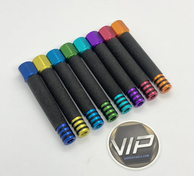 VIP 3.0  STANDARD PDR Interchangeable  Knockdown  Aluminum core, anodized color Built in large magnet to prevent rolling on steel Standard thread 5/16 Thick soft rubber cushion grip to reduce vibrations 3 7/8" long  (98mm) 4 7/8" long (124mm) with ti...