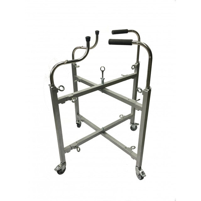 The main bearing parts of the stand are made of durable aluminum profile tube 30x30 mm. Retractable adjustable supports are made of polished stainless steel d = 20 mm. Also sliding guides of the stand along the “X” axis are made of stainless steel profile pipe. The stand rests on four hardware rollers d=75 mm. with fixation, which makes it mobile. In the center of the stand there is a removable latch for locking the trunk lid. On the S -shaped retractable supports there are half rings for additional fixation of the repaired part and a rubber support tip. All movable parts of the stand are fixed with a ring screw, which provides maximum convenience when fixing the part with ties to the table.